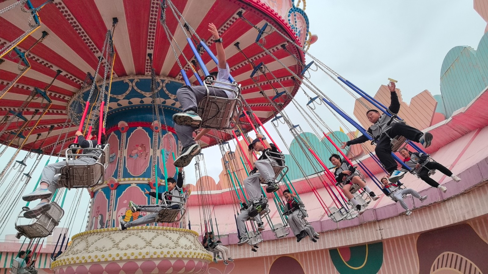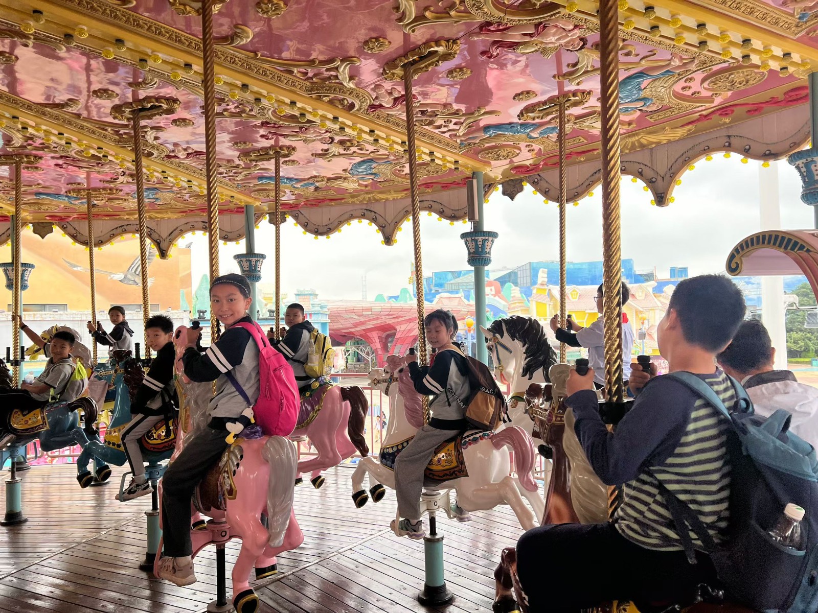 在“甜品王国”区域,同学们仿佛闯入了梦幻的童话世界。旋转木马缓缓转动,大家坐在色彩斑斓的木马上,张开双臂感受微风,脸上洋溢着纯真的笑容。而在“遗落要塞”,勇敢的同学们挑战了“飞翼过山车”,快速的俯冲、翻转与失重感,让大家在惊险刺激中释放着活力,下来后虽然心跳加速,却都兴奋地讨论着刚才的感受,直呼“过瘾”!