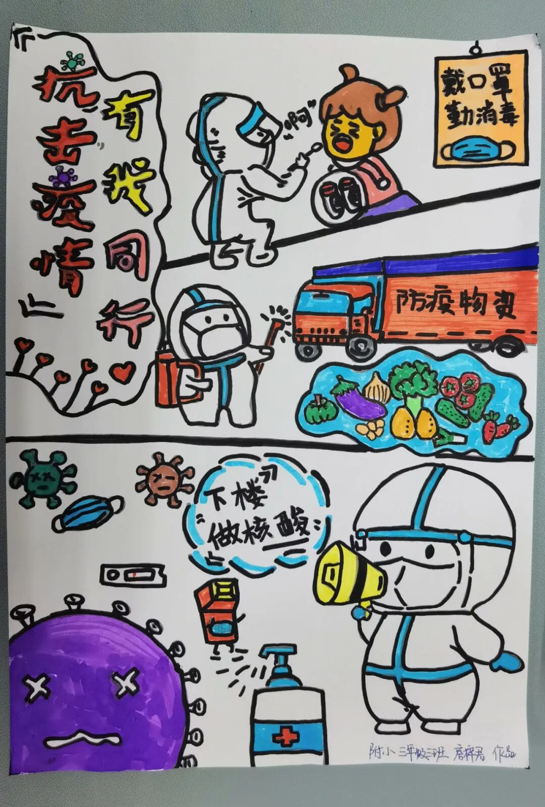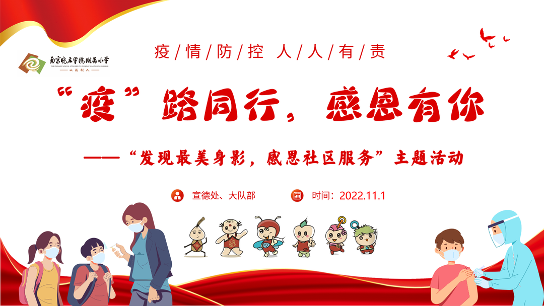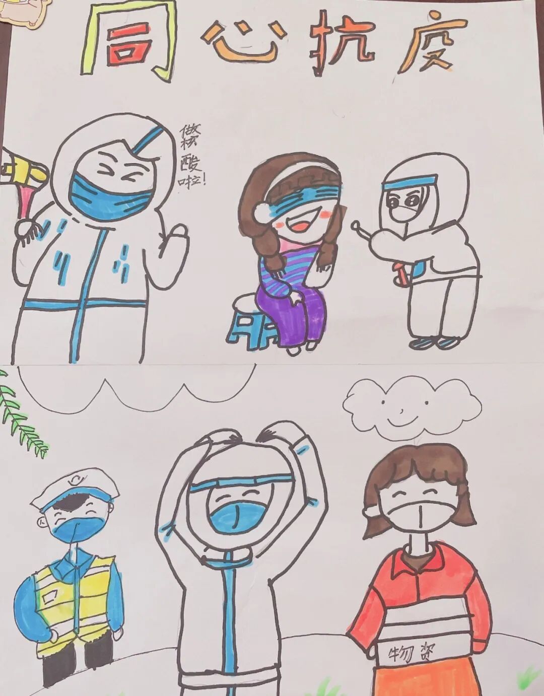 学会感恩·学会生活 ——晓院附小“发现身边最美身影,感恩社区志愿服务”主题活动 偶有阴云,终会散去 因疫情我们不得不暂停线下学习,改为居家学习。为了保障我们的生活,有许多叔叔阿姨放弃与家人的欢聚时光,穿上防护服、红马甲、蓝马甲,投身到疫情防控的工作中。他们为了大家,舍弃了自己的小家,却从不叫苦,从未退缩,是我们学习的榜样。为了表达我们的感恩之情,为抗疫贡献一份小小力量,南京晓庄学院附属小学宣德处、大队部迅速组织“发现身边最美身影,感恩社区志愿服务”主题教育活动。 下面就让我们一起来看看,都有哪些陶娃发来了为社区防疫志愿者们点赞的报道吧! 二2班 夏心城 我为社区志愿服务点赞 我是南京晓庄学院附属小学二年级2班的夏心城同学。由于栖霞区疫情防控需要,我们小区被封控了。在这特殊的时期,小区里到处都能看到医护人员和志愿者的身影。这群可爱的人们为我们做核酸,为我们发放物资。感谢政府!感谢一线的工作人员!你们辛苦了。 一4班 徐锦昊 面对这场突如其来的疫情,全栖霞不分年龄,不分职业的人纷纷在关键时刻挺身而出,舍小家顾大家,病毒无情,人间有情。 在我的印象中,从小区管控的那天起,我就没看到爸爸回来了,实在太想爸爸,所以跟他视了个频,看到爸爸穿着厚厚的防护服,戴着口罩跟眼罩,妈妈说爸爸每天都要安排八卦洲街道中桥村的全员核酸工作,黄转绿码,上门安装门磁等,看到大白爸爸,我以他为榜样,最后让我们一起期待疫情早点过去,静候春暖花开! 四4班 孙邵杰