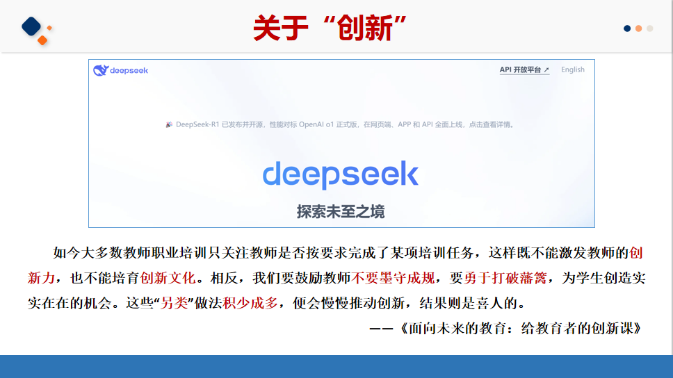 随后,徐鹏阳老师围绕deepseek与《哪吒之魔童闹海》两大热点,与老师们分享了自己对于“创新”与“实践”这两个关键词的理解,并对青年教师提出几点期待。