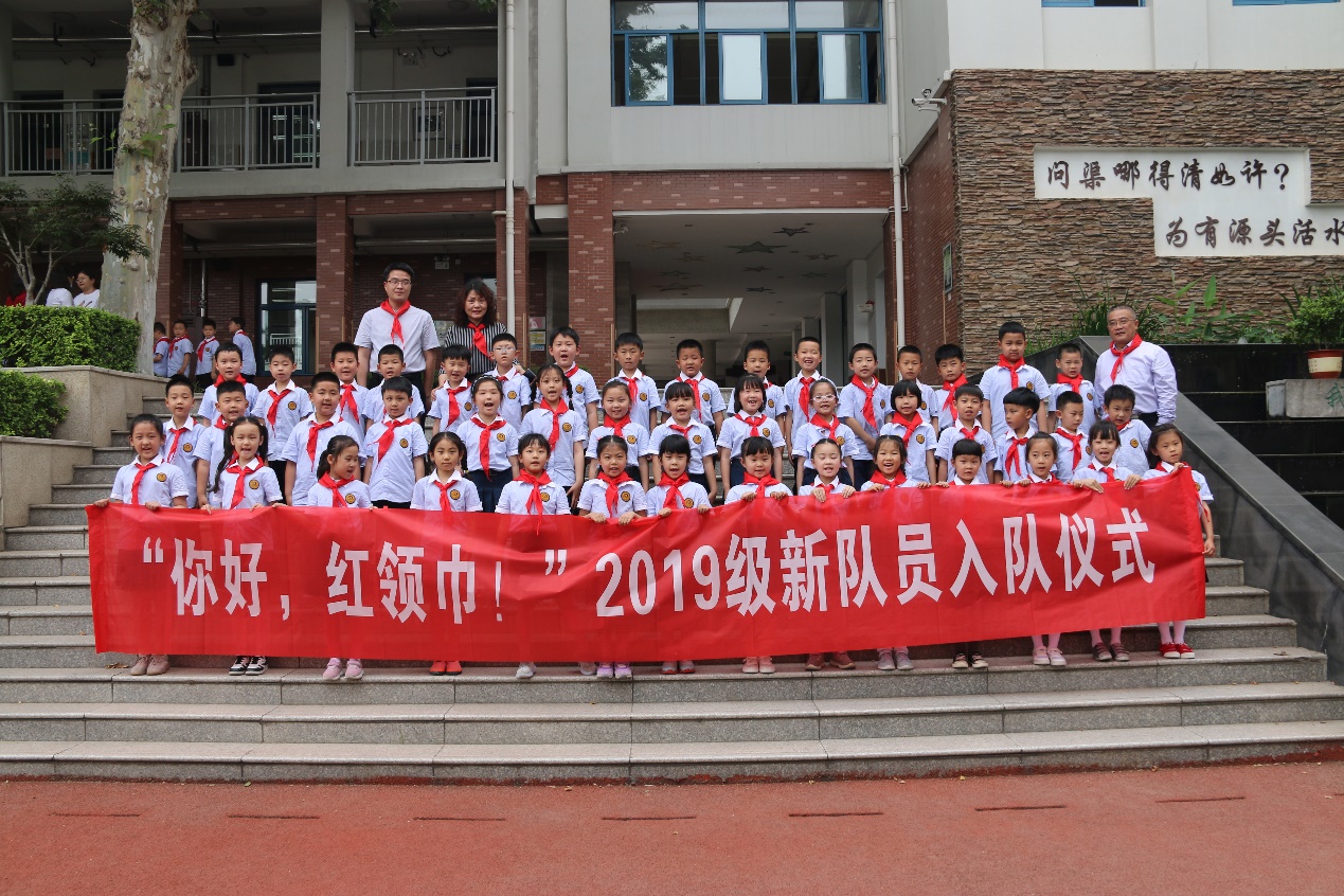 队歌声中,小同学分批上台,教研员和党员教师代表一同为队员佩戴红领巾并合影留念