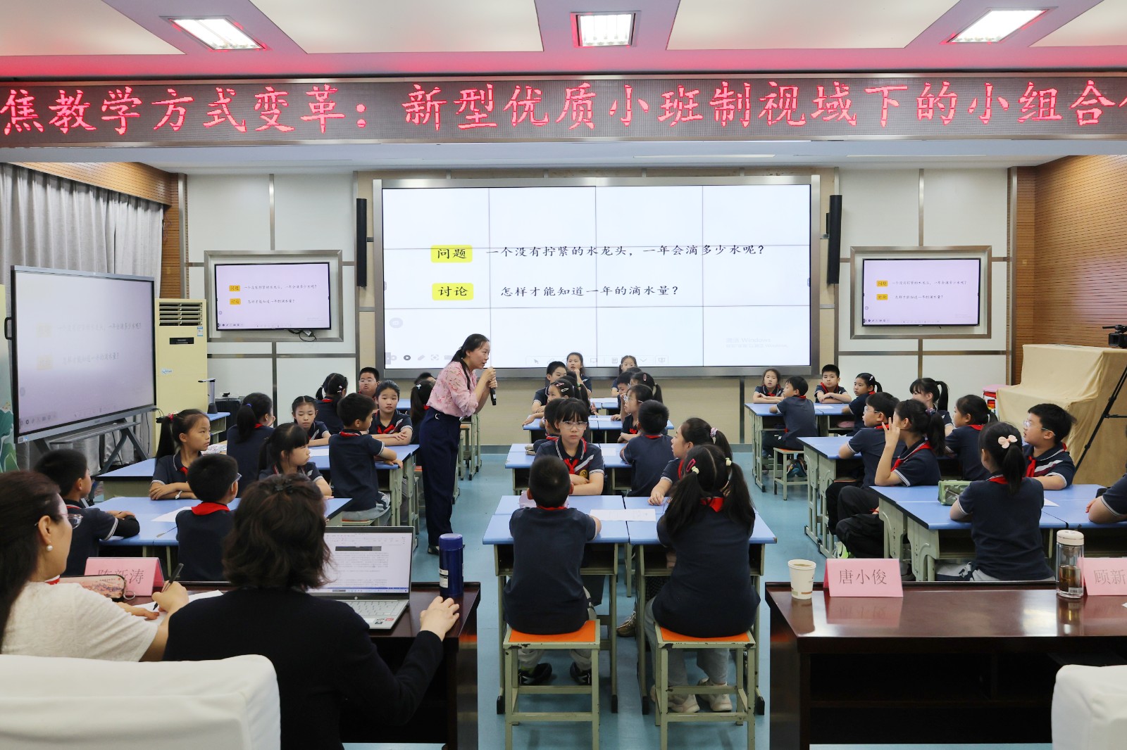 金陵小学的李新副校长和四(2)班的同学带来了一节精彩的课堂——《一滴水的力量》。李老师创设节水的生活情景,通过“制定方案—合作实验—小组汇报” 的递进式学习路径,引导学生认识到一滴水的重要性,体悟数学学习的价值与意义。