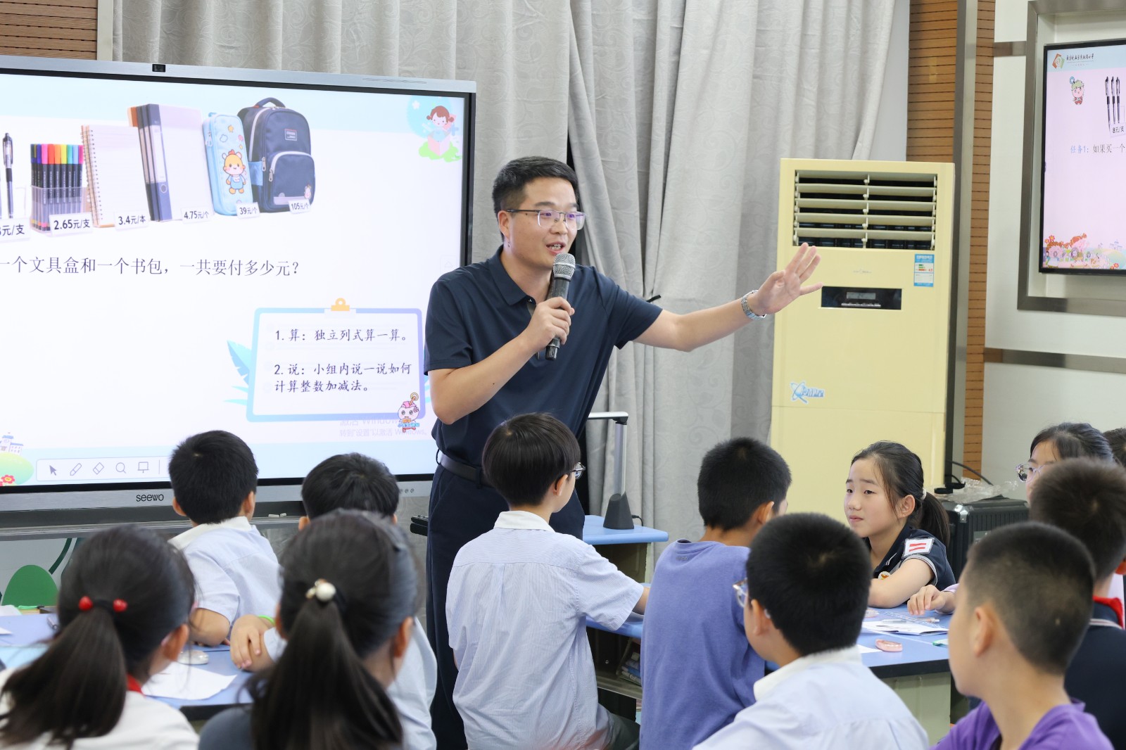第三节课是由南京晓庄学院附属小学的顾新佳副校长执教的《小数加、减法》。顾校长创设购物情境,带领学生回顾旧知,利用经验迁移引导学生自主探究小数加法的笔算方法。接着,顾校长组织学生自主探究小数减法,在合作交流中使学生深刻体悟算理的一致性。