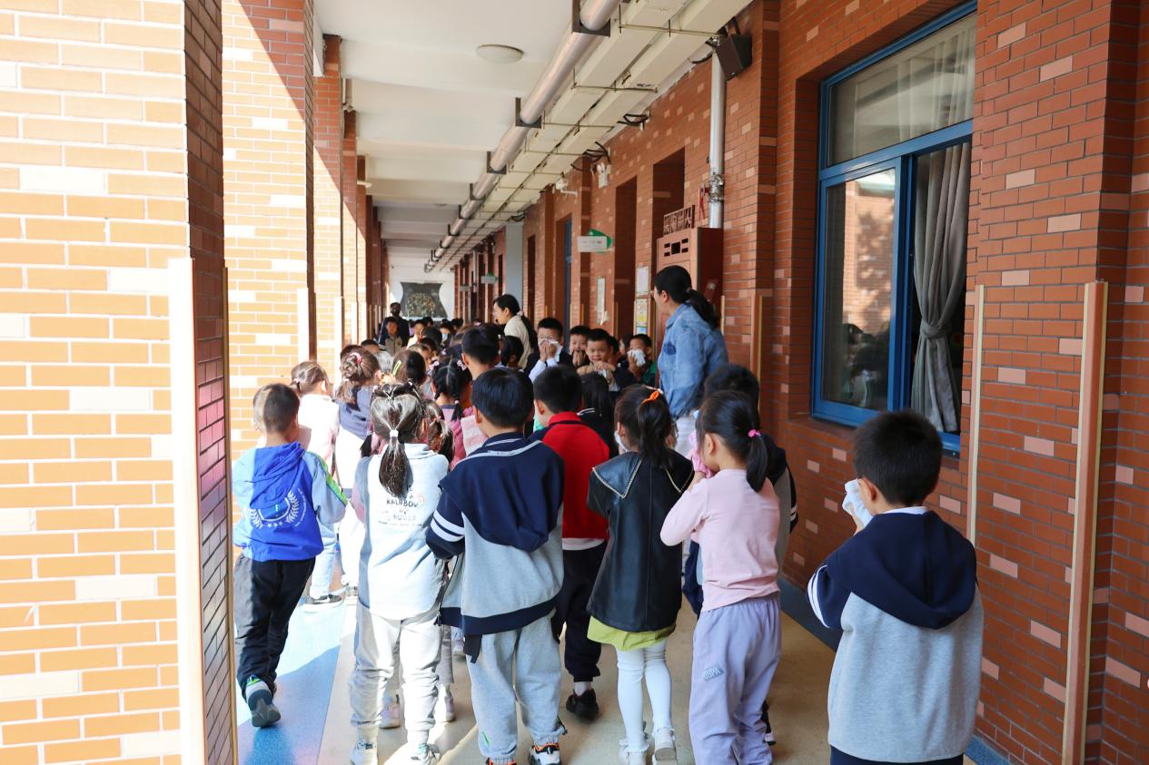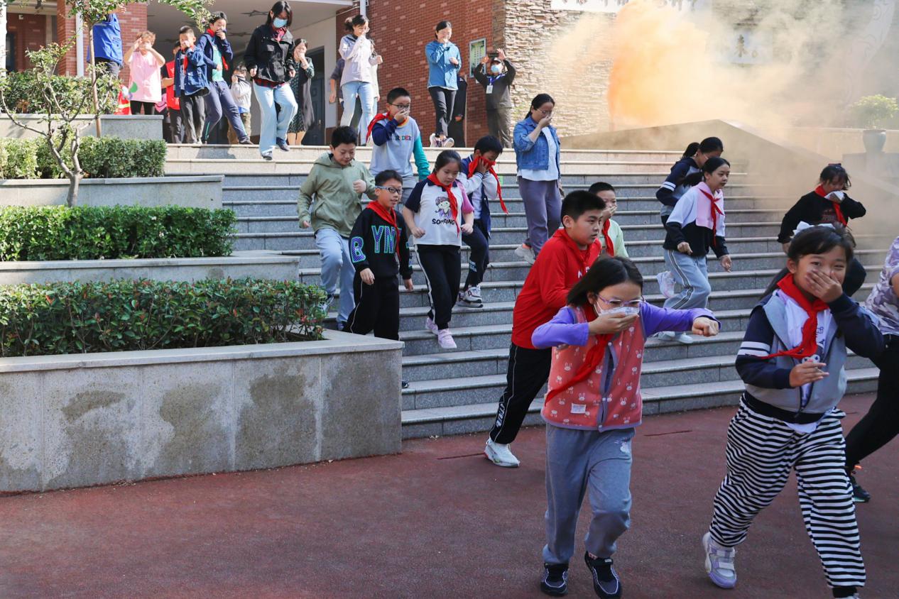 上午第二节课快要结束时,校园里突然响起了警报铃声,一听到警报声,孩子们立刻跟着老师们用湿毛巾捂住口鼻,沿着班级预定路线快速弯腰靠右前行,迅速撤向空旷的操场,整个疏散过程井然有序。
